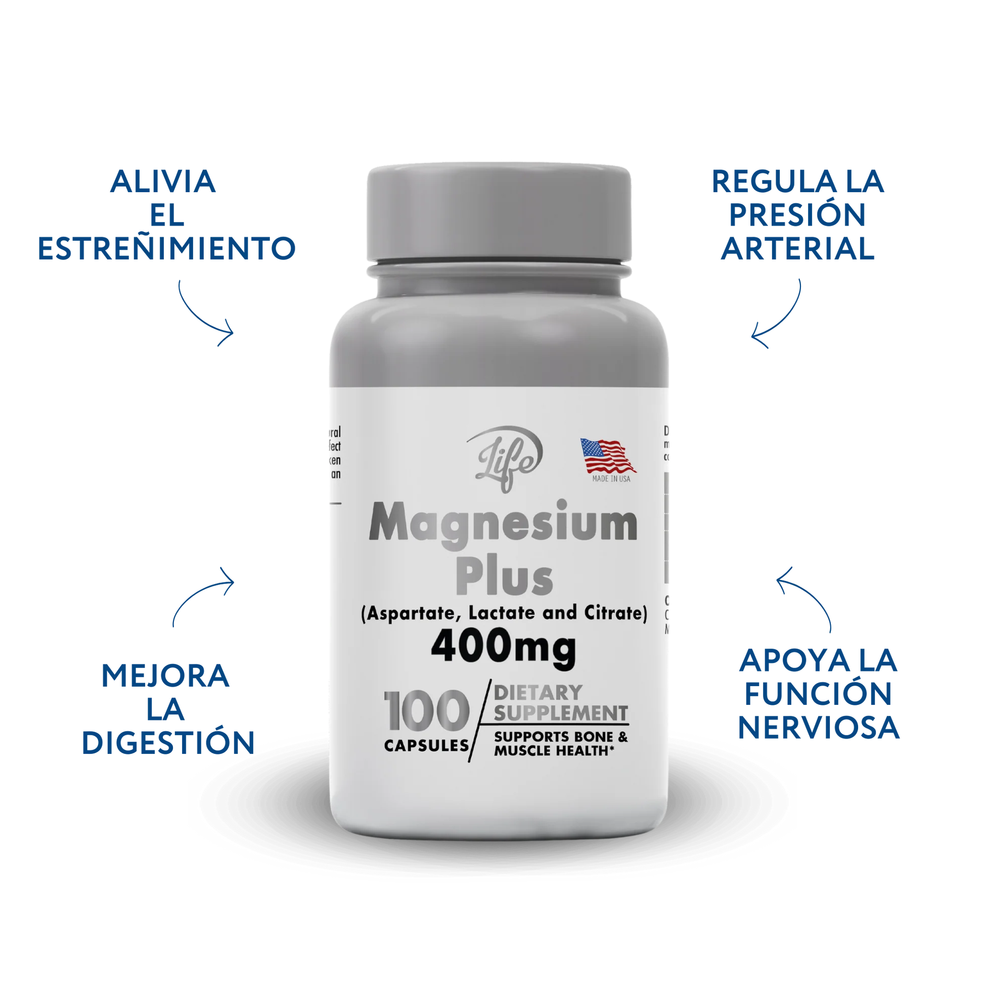 RECUPERA TU ENERGÍA Y BIENESTAR CON MAGNESIUM PLUS, UN SUPLEMENTO PREMIUM FORMULADO CON ASPARTATO, LACTATO Y CITRATO DE MAGNESIO PARA UNA MEJOR ABSORCIÓN. EL MAGNESIO ES ESENCIAL PARA MANTENER HUESOS FUERTES, MÚSCULOS SALUDABLES Y UN SISTEMA NERVIOSO EQUILIBRADO.